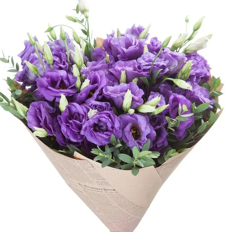 Букет состоит из 19 веток сиреневой эустомы, зелень, крафт, атласная лента.