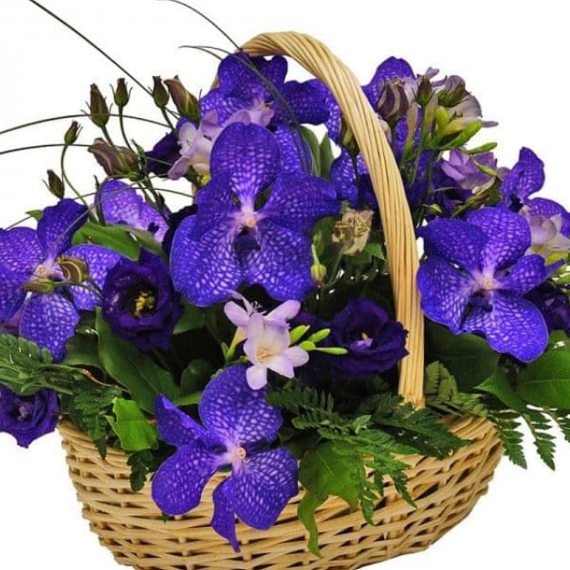 Букет состоит из 7 орхидей, 4 ветки эустомы, 4 фрезии, зелень, корзина, оазис.