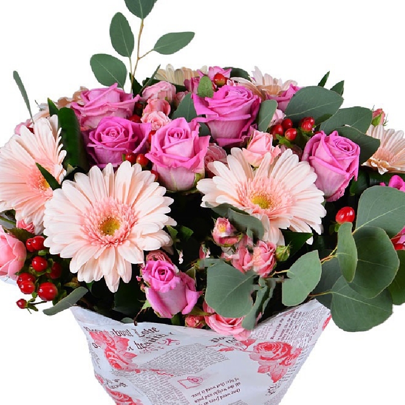 Букет состоит из 11 розовых роз, 7 кустовых роз, 7 гербер, 6 гиперикум, эвкалипт, крафт, атласная лента.