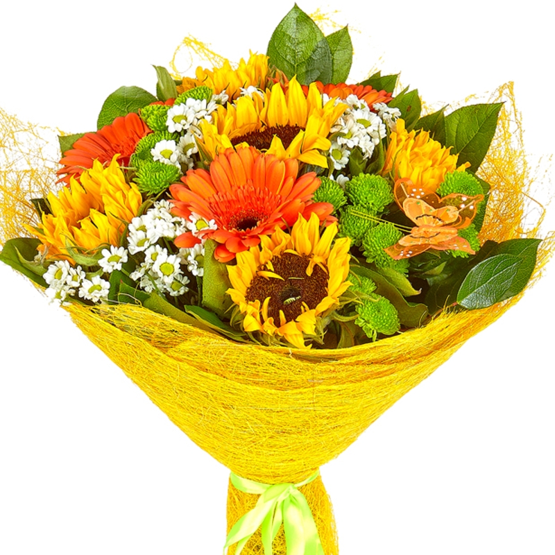Букет состоит из 5 подсолнухов, 3 гербера, 4 зеленые хризантемы, 5 веток танацетума., зелень, красивая упаковка, атласная лента.