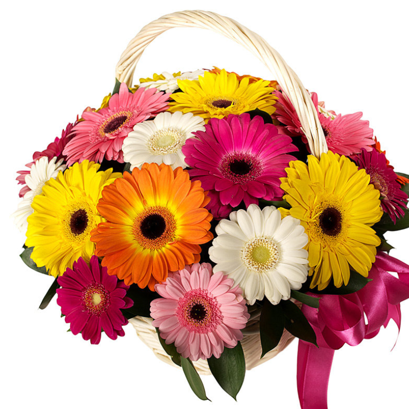 Букет состоит из MIX 15 из гербер, зелень, корзина, атласная лента.
