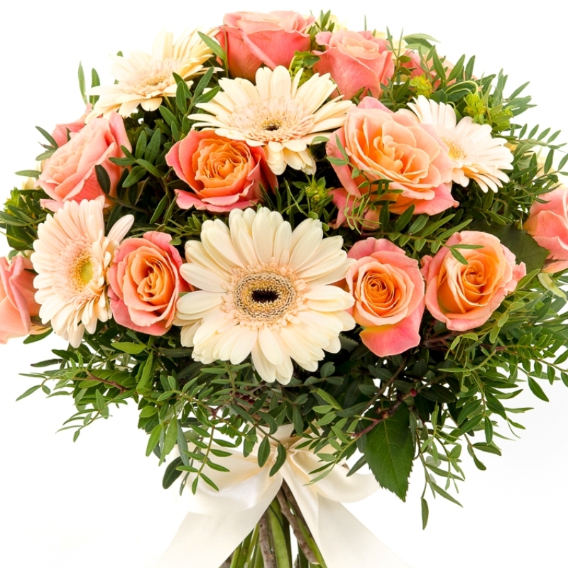 Букет состоит из 15 роз, 9 гербер, писташ, 4 буплерум, прозрачная упаковка, атласная лента.