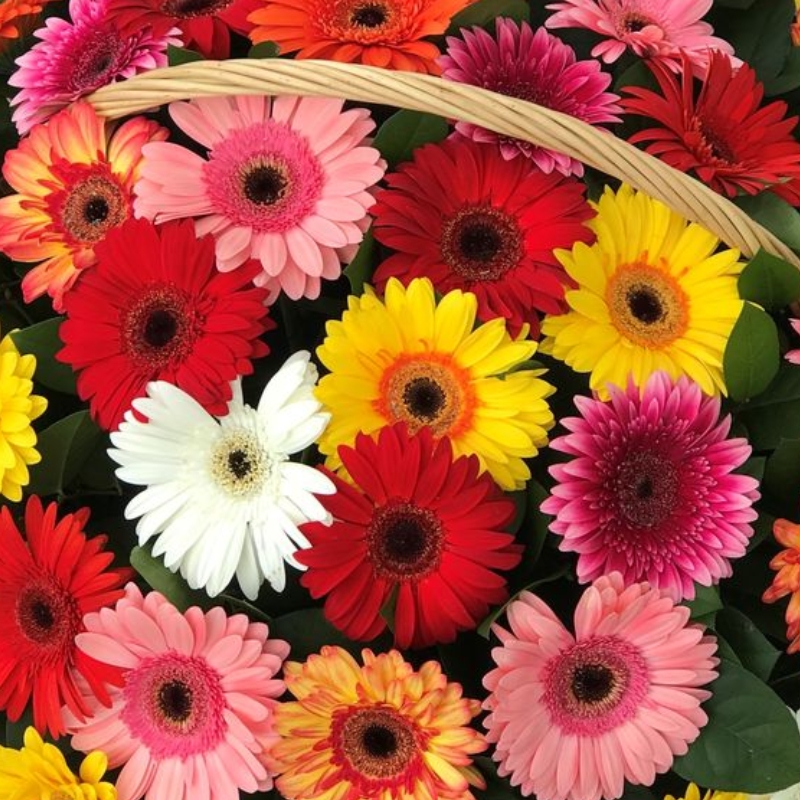 Букет состоит из MIX из 101 гербера, зелень, корзина.