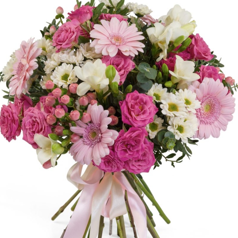 Букет состоит из 5 гербер, 4 кустовые розы, 6 фрезий, 4 ветки хризантемы, 7 гиперикум, зелень, прозрачная упаковка, атласная лента.