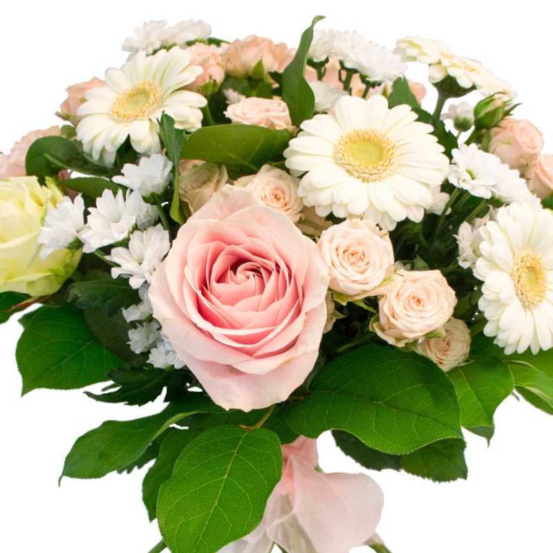 Букет состоит из 3 белые розы, 3 розовые розы, 4 кремовых кустовых роз, 4 кустовых ромашковых хризантем, 5 белых гербер, зелень, прозрачная упаковка, атласная лента.