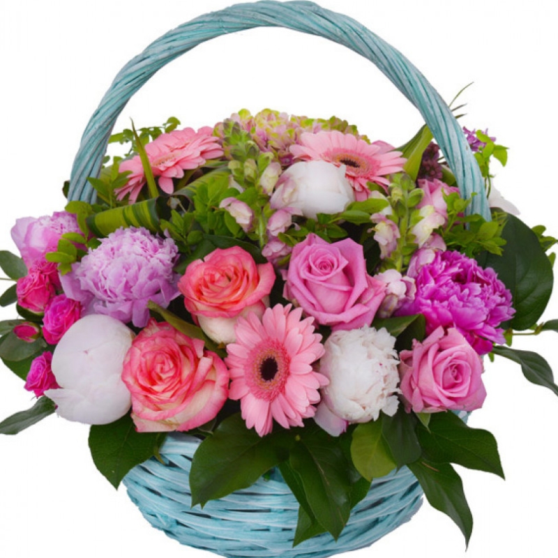 Букет состоит из 9 пионов, 7 роз, 1 ветка кустовой розы, 3 гербера, 1 гортензия, 2 гиацинта, зелень, корзина, оазис.