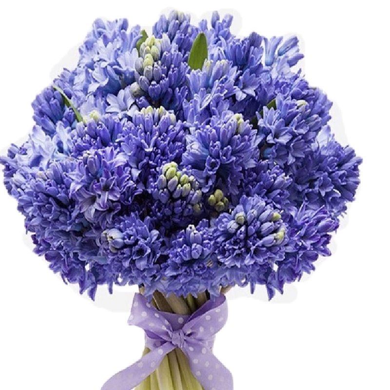 Букет состоит из 25 синих гиацинтов, прозрачная упаковка, атласная лента.