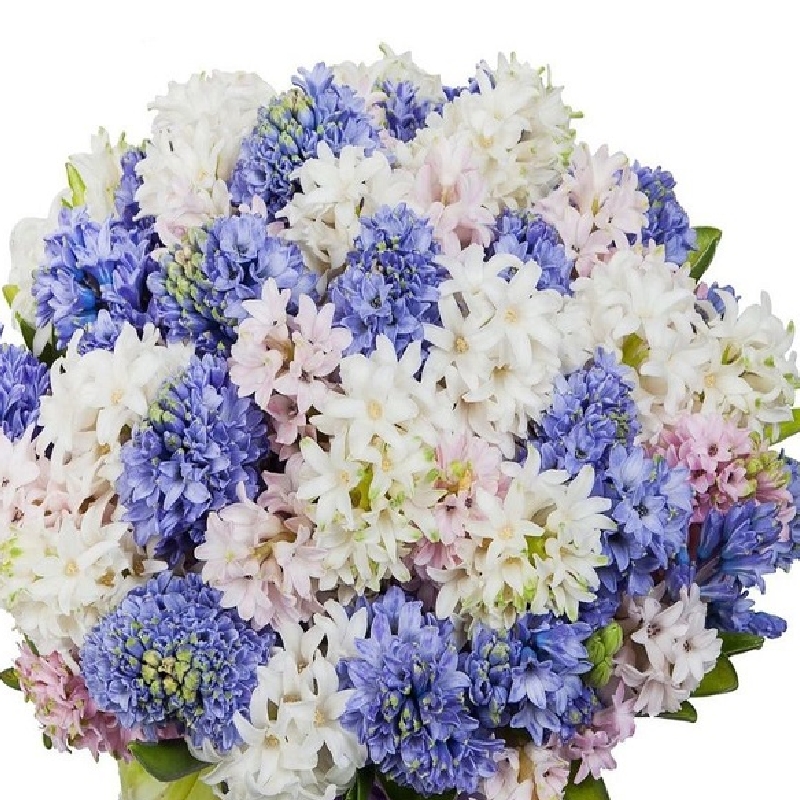 Букет состоит из MIX из 45 гиацинтов, прозрачная упаковка, атласная лента.