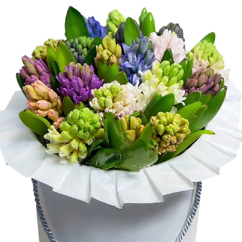 Букет состоит из 19 гиацинтов, коробка, оазис.