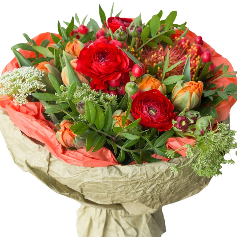Букет состоит из 3 ранункулюса, 9 тюльпанов, 3 ветки гиперикума, 5 амми, 1 леукоспермум, зелень, крафт, атласная лента.