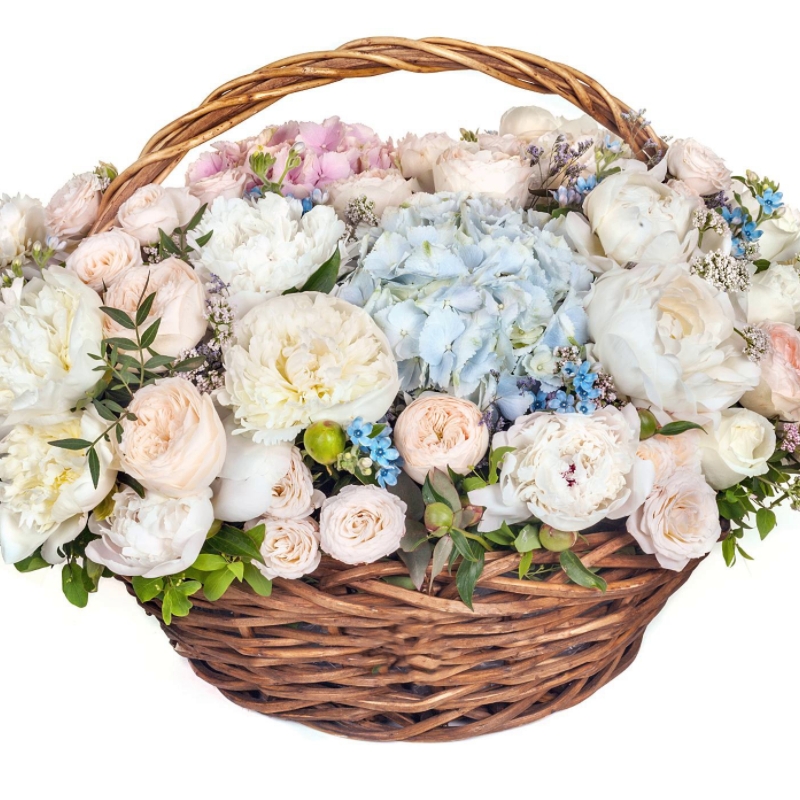 Букет состоит из 15 пионов, 2 гортензии, 8 веток пионовидных кустовых роз, 5 гиперикум, 7 озотамнус, зелень, корзина, оазис.