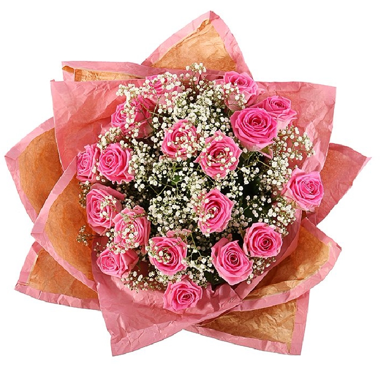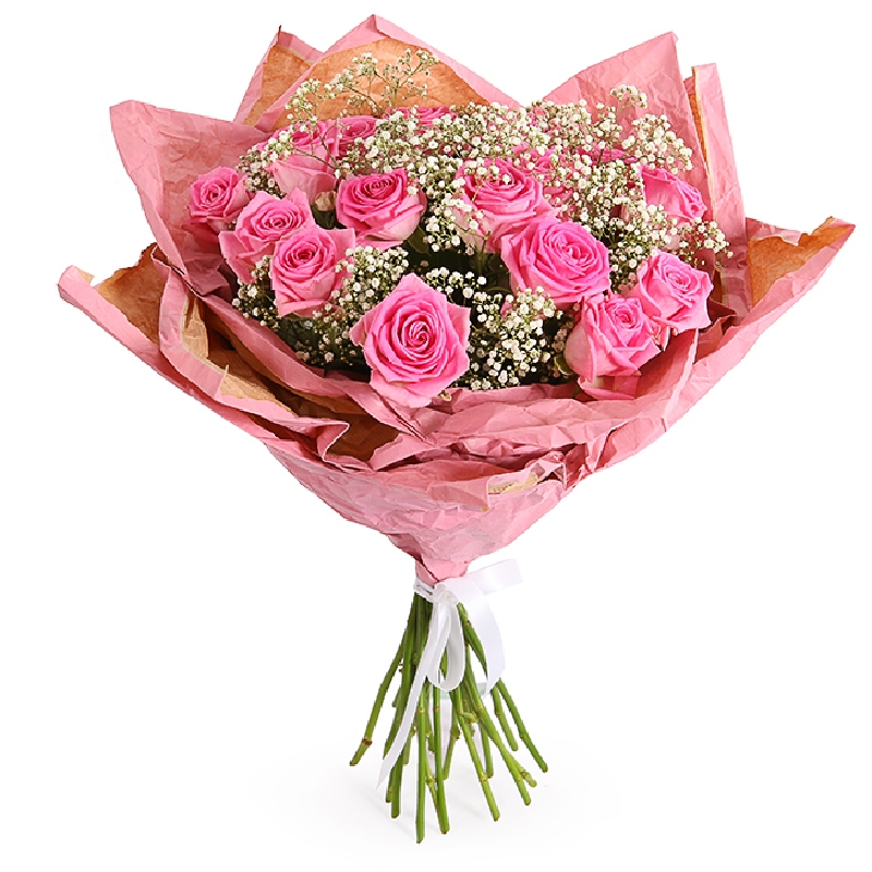 Букет состоит из 19 розовых роз, 3 ветки гипсофилы, крафт, атласная лента.