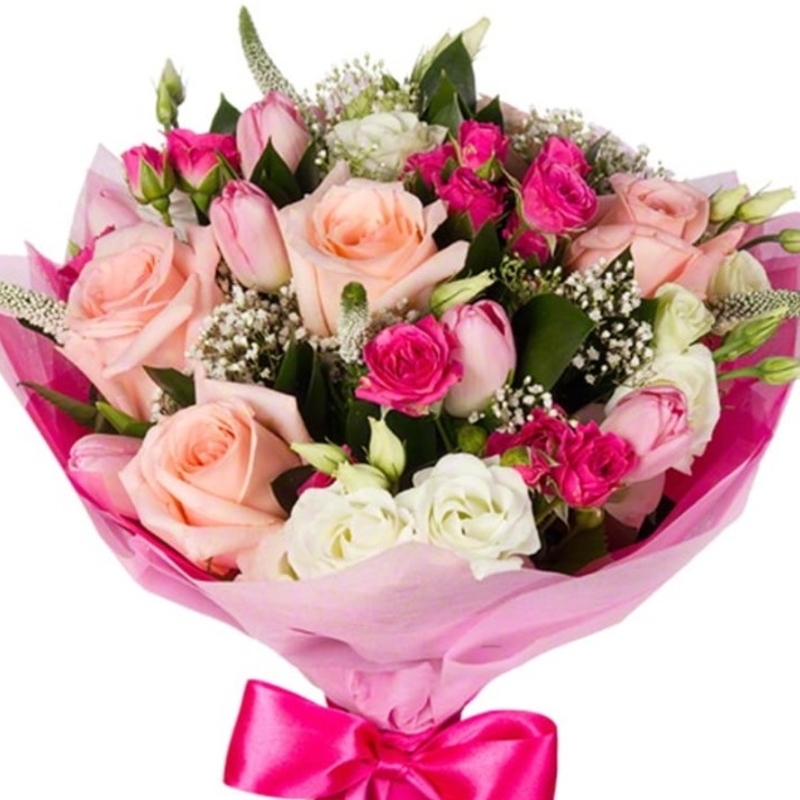 Букет состоит из 5 розовых роз, 4 малиновые кустовые розы, 3 эустомы, 7 розовых тюльпанов, 4 гипсофила, декоративная зелень, красивая упаковка, атласная лента.