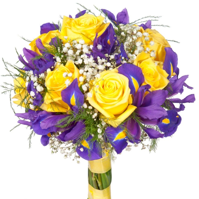 Букет состоит из 7 желтых роз, 11 ирисов, 3 гипсофила, зелень, прозрачная упаковка, атласная лента.