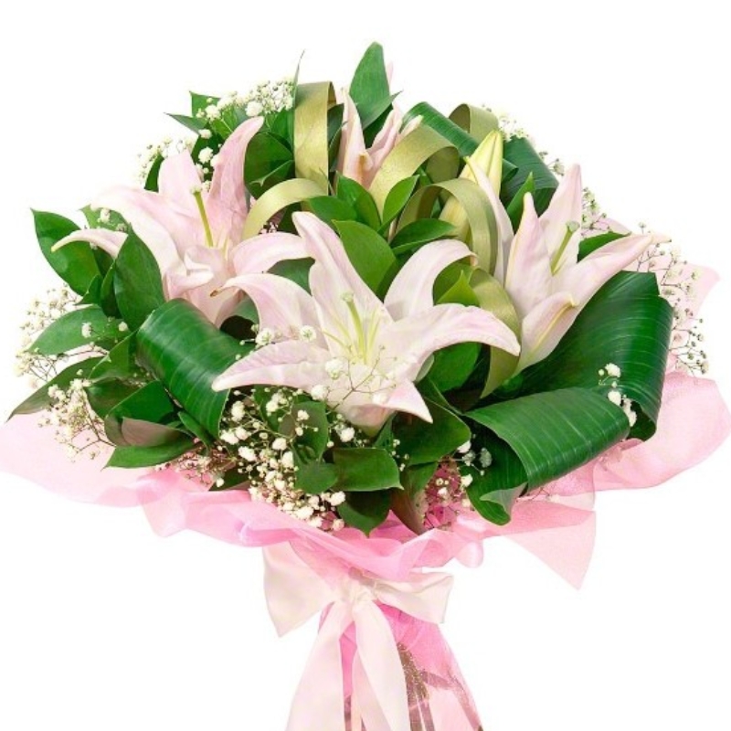 Букет состоит из 3 розовые лилии, 6 гипсофила, аспидистра, красивая упаковка, атласная лента.