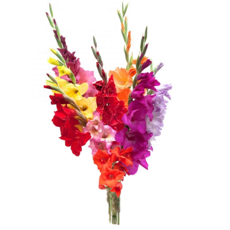 Букет состоит из MIX из 19 гладиолусов, прозрачная упаковка, атласная лента.