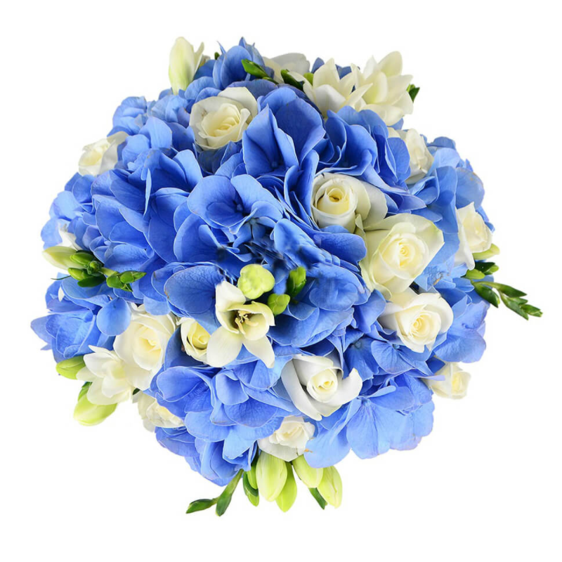 Букет состоит из 1 голубая гортензия, 11 белых роз, 5 веток эустомы, прозрачная упаковка, атласная лента.