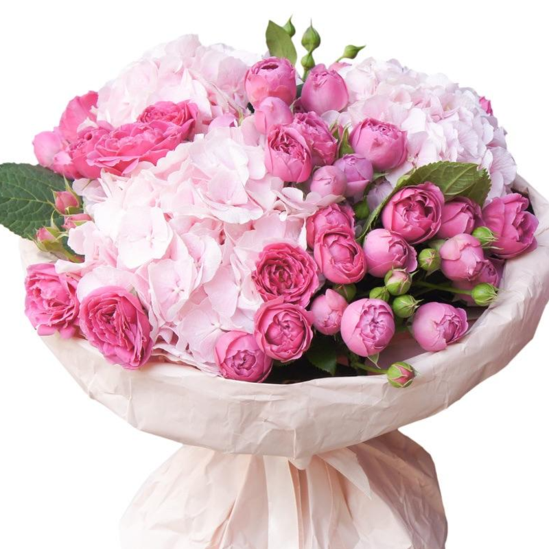 Букет состоит из 3 розовые гортензии, 10 веток пионовидных роз, зелень, крафт.