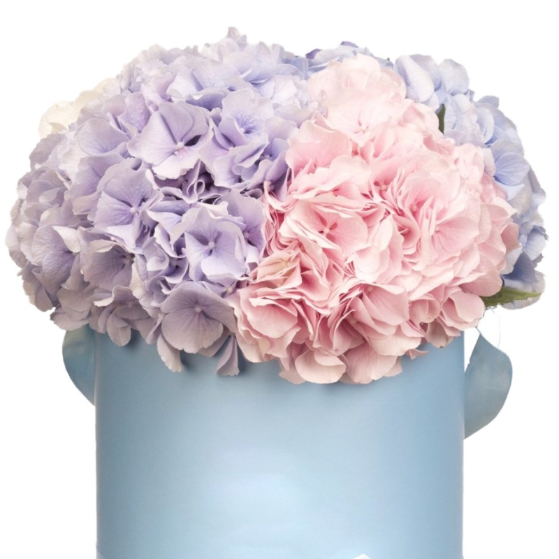 Букет состоит из 5 гортензий, коробка, атласная лента, оазис.