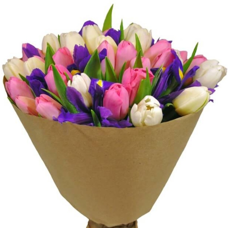 Букет состоит из 25 белых и розовых тюльпанов, 10 ирисов, зелень, крафт, атласная лента.