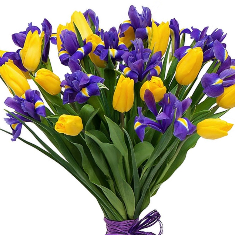 Букет состоит из 15 желтых тюльпанов, 16 ирисов, прозрачная упаковка, атласная лента.