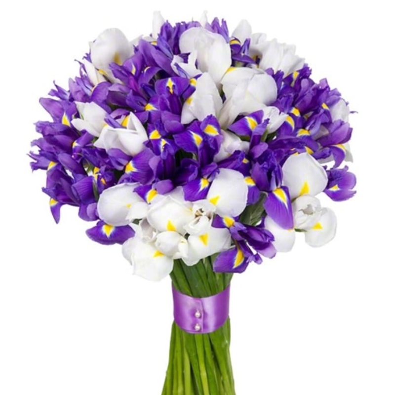 Букет состоит из 30 синих ирисов, 21 белый ирис, синяя или сиреневая лента.