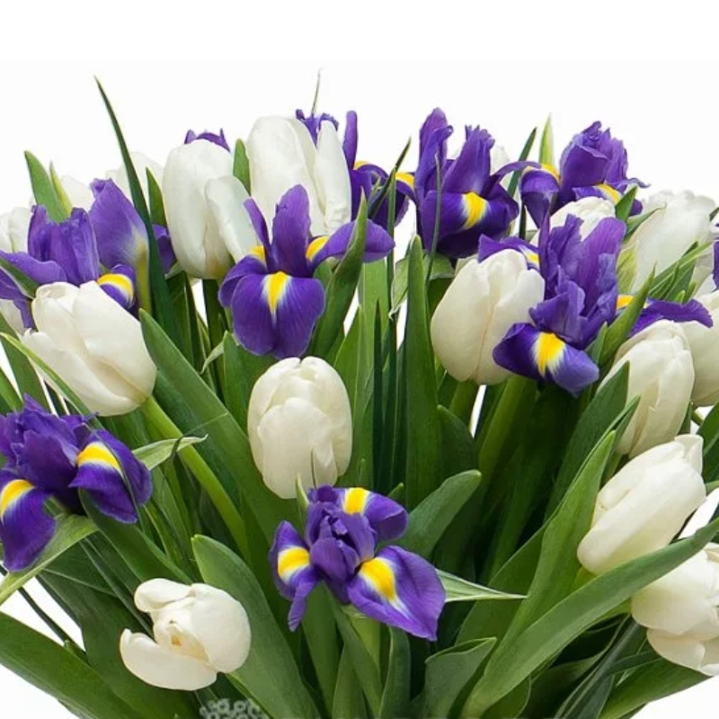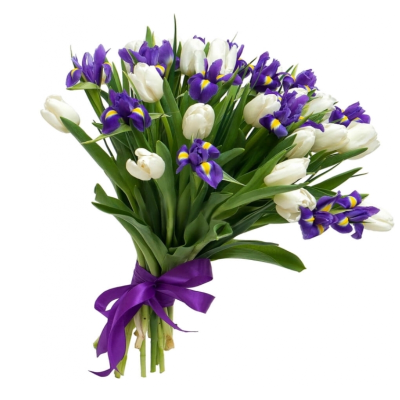 Букет состоит из 21 белый тюльпан, 14 ирисов, прозрачная упаковка, синяя лента.