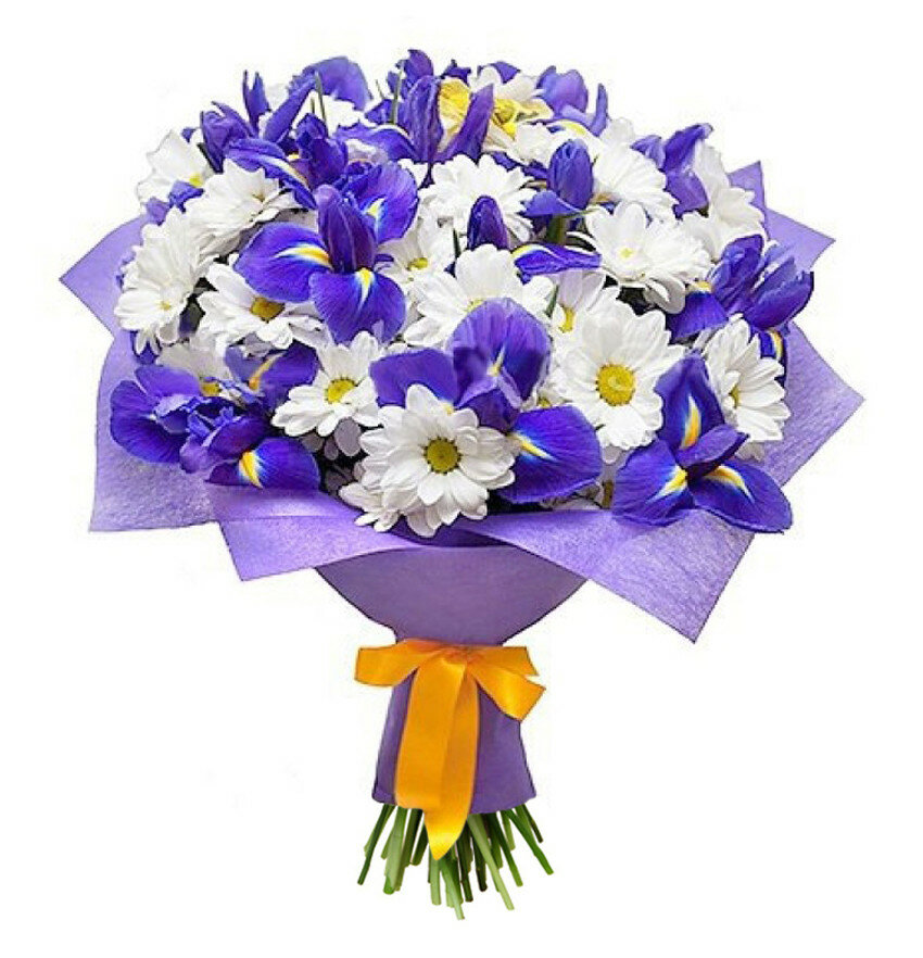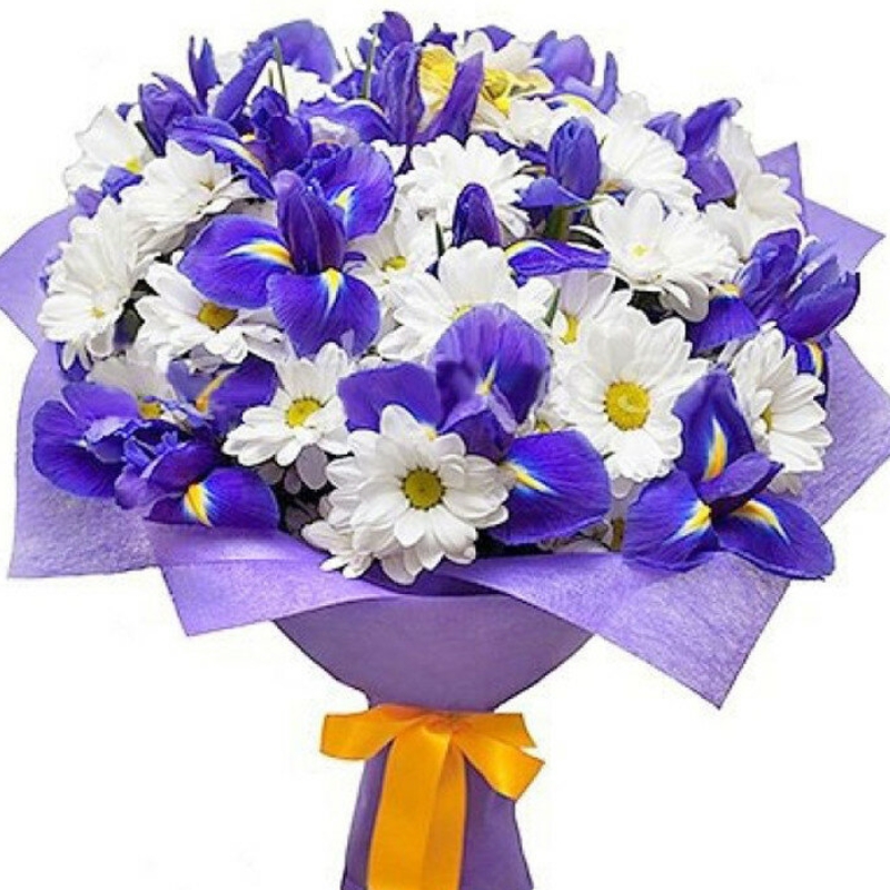 Букет состоит из 21 ирис, 5 веток белой хризантемы, красивая упаковка, атласная лента.