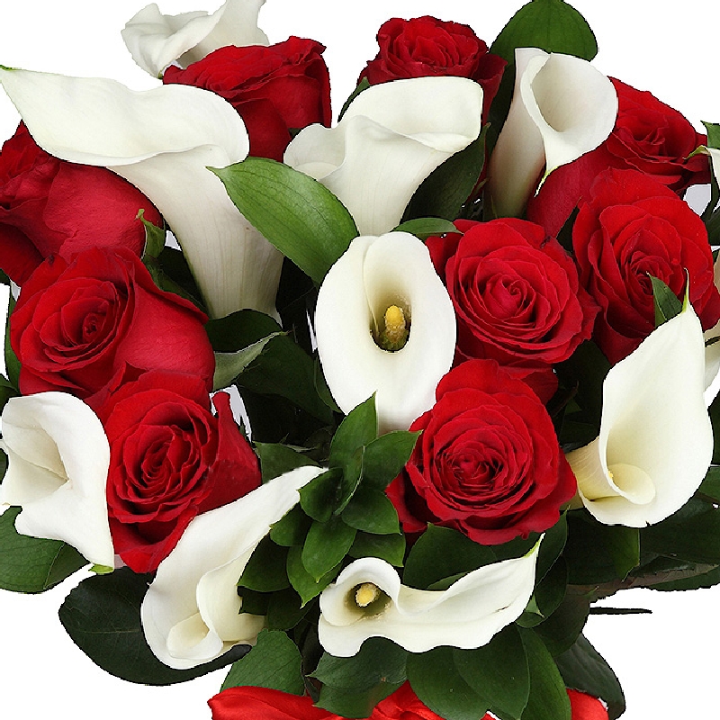 Букет состоит из 10 белых калл, 9 роз, рускус, прозрачная упаковка, атласная лента.