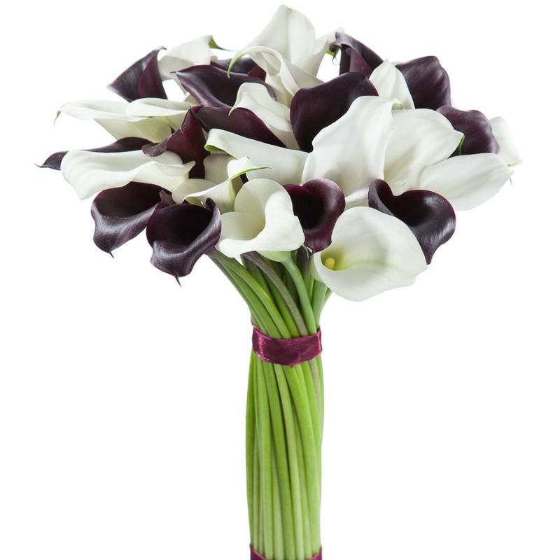 Букет состоит из MIX из 25 белой и черной каллы, прозрачная упаковка, атласная лента.