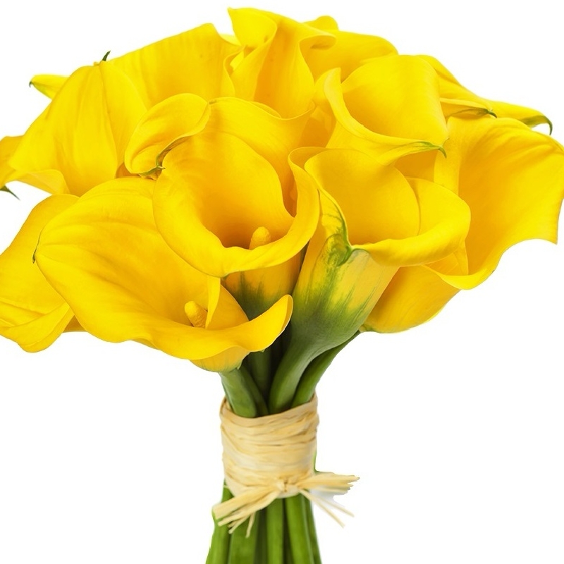 Букет состоит из 15 желтых калл, прозрачная упаковка, лента.