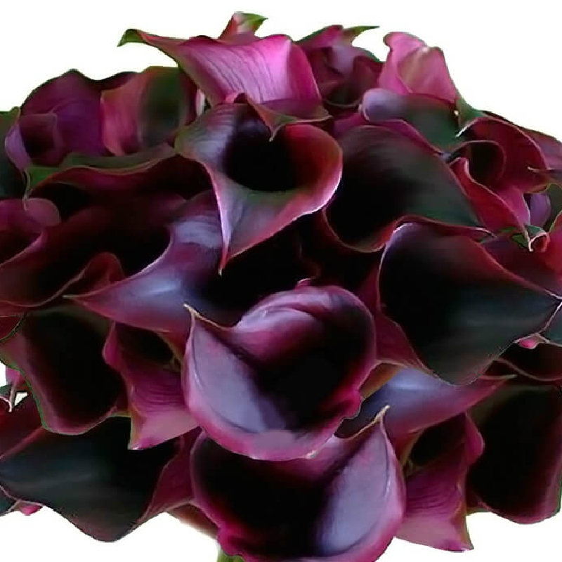 Букет состоит из 35 бордовых калл, прозрачная упаковка, атласная лента.