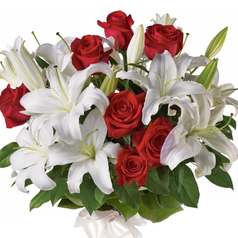 Букет состоит из 7 красных роз, 4 ветки белой лилии, прозрачная упаковка, атласная лента.