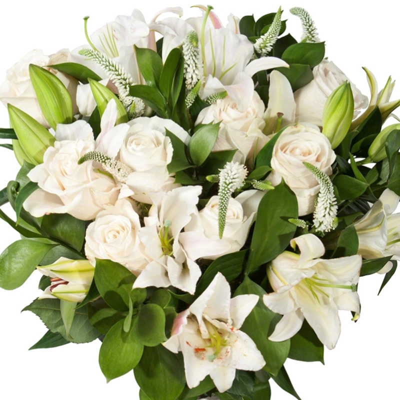 Букет состоит из 9 белых роз, 4 белые лилии, зелень, прозрачная упаковка, атласная лента.