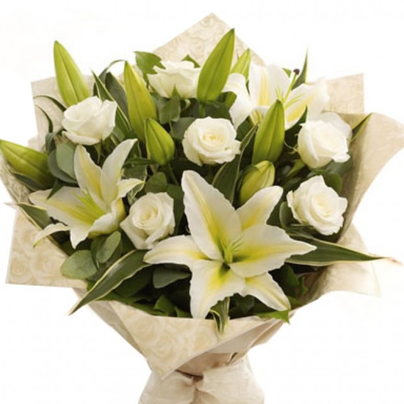 Букет состоит из 3 белых лилии, 9 белых роз, крафт, атласная лента.