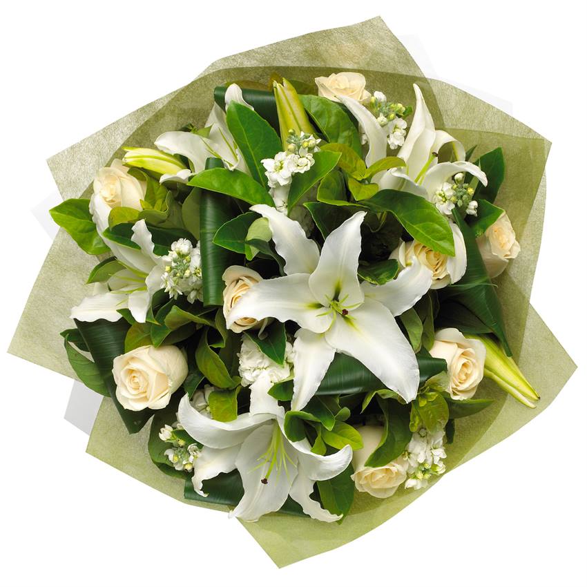 Букет состоит из 5 белых роз, 3 белые лилии, 5 веток белой маттиолы, зелень, фетр, атласная лента.