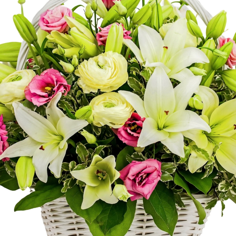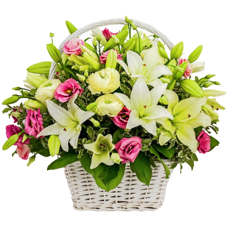 Букет состоит из 7 лилий, 5 ранункулюсов, 10 веток эустомы, зелень, корзина, оазис.