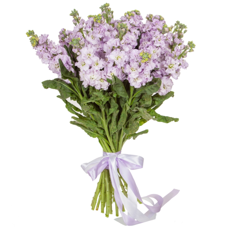 Букет состоит из 19 сиреневых маттиол, прозрачная упаковка, атласная лента.