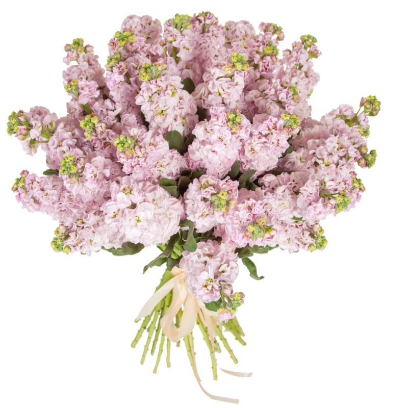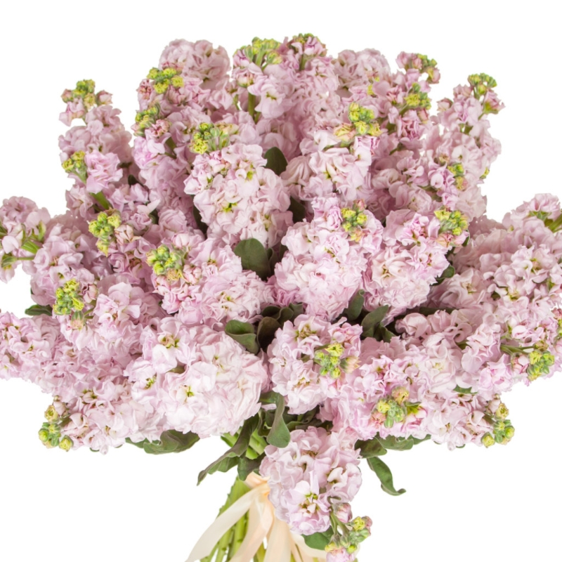 Букет состоит из 31 нежно-розовая маттиола, прозрачная упаковка, атласная лента.