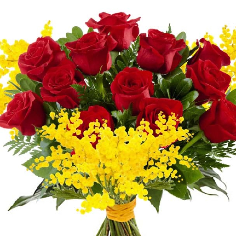 Букет состоит из 13 красных роз, 6 веток мимозы, прозрачная упаковка, атласная лента.