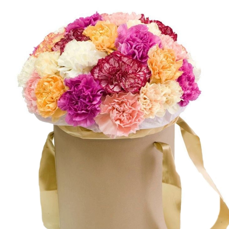 Букет состоит из MIX из 25 гвоздик, коробка, оазис.