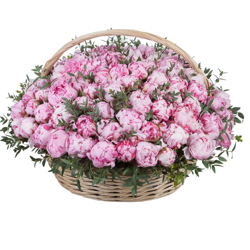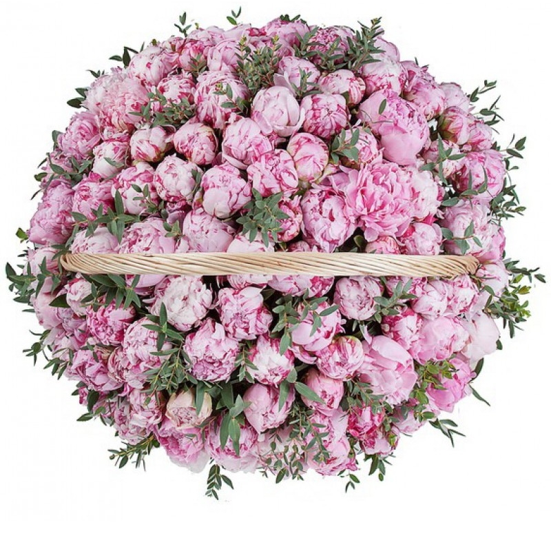 Букет состоит из 101 пион, зелень, корзина, оазис.