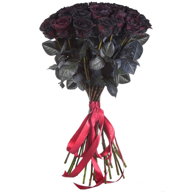 Букет состоит из 26 черных роз, прозрачная упаковка, атласная лента.