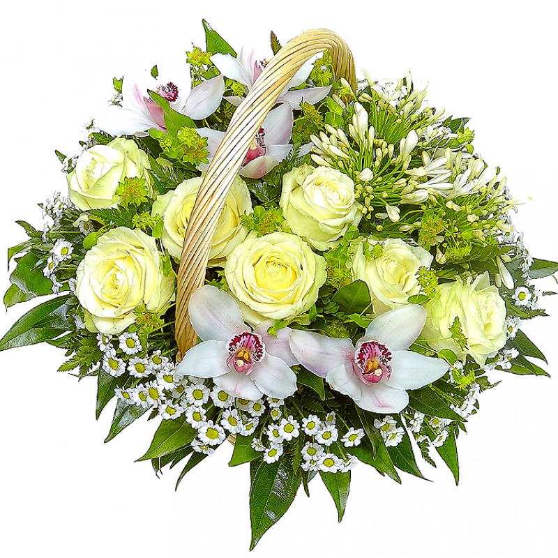 Букет состоит из 7 белых роз, 5 орхидей, 6 веток хризантем Сантини, 3 агапантуса, зелень, корзина, оазис.