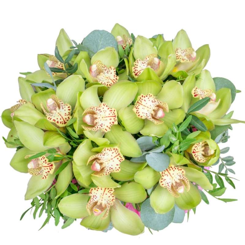 Букет состоит из 15 орхидей, зелень, коробка, оазис.