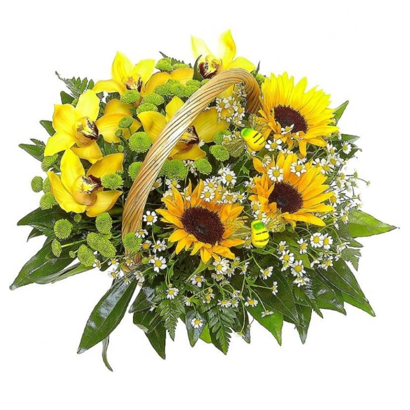 Букет состоит из 3 подсолнуха, 3 ветки хризантемы, 6 веток танацетума, 5 орхидей, зелень, корзина, оазис.