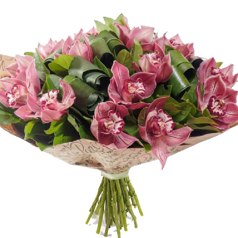Букет состоит из 15 орхидей, аспидистра, крафт, атласная лента.