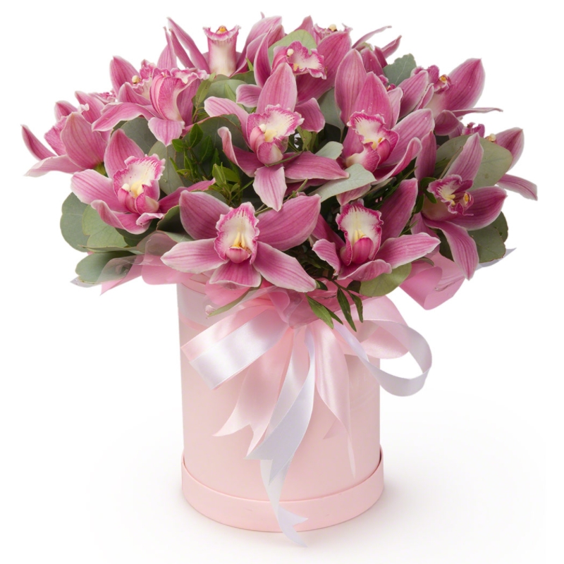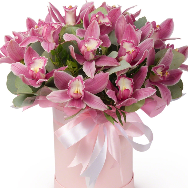 Букет состоит из 19 розовых орхидей, зелень, коробка, оазис, атласная лента.