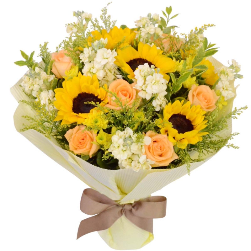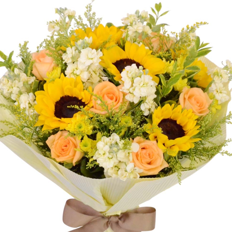 Букет состоит из 5 подсолнухов, 7 кремовых роз, 7 веток маттиолы, 7 солидаго, зелень, упаковка, лента.