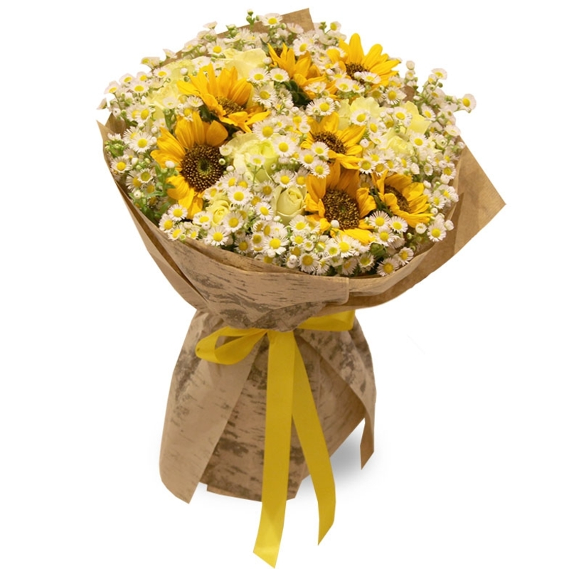 Букет состоит из 7 подсолнухов, 10 роз, 10 веток танацетума, зелень, крафт, атласная лента.